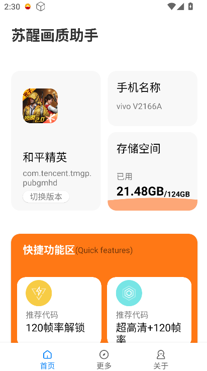 打开苏醒画质助手 APP 后,首页会直接呈现「吃鸡配置」与「王者配置」两大选项,点击选中「吃鸡配置」即可进入专属优化界面。