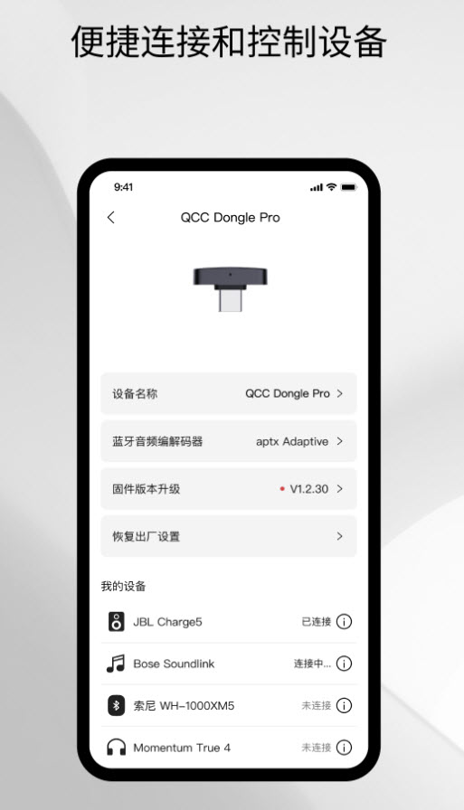 旷世之声 app 以简洁设计美学为核心,界面清爽直观,功能布局清晰合理。不管是刚接触这类工具的新手,还是熟悉数码产品的资深玩家,都能快速上手,轻松完成 QCC Dongle、QCC Dongle Pro 设备的连接与管理,无需花费过多时间学习操作。