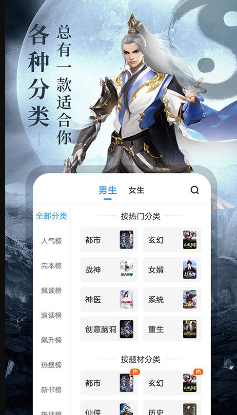 【热门分类】网罗都市、言情、玄幻、武侠、穿越、悬疑等热门分类,不管是白天摸鱼看,还是晚上睡前读,都能找到陪你度过时光的好书;