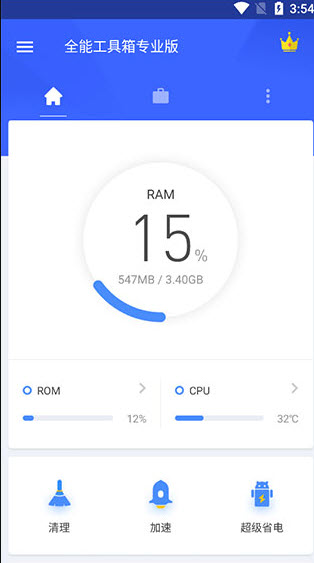 1、打开软件后进入主页,页面会直接展示手机当前的核心状态:包括运行内存占用率、CPU 实时温度、手机剩余存储空间;同时,主页下方陈列着核心功能入口,如清理、加速、超级省电、WiFi 分析、文件管理器、开机加速、应用管理、CPU 降温,点击对应图标即可直接使用功能。