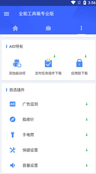 2、AIO 特有功能:添加启动项(自定义开机启动应用)、定时任务插件下载(获取自动任务工具)、应用锁下载(安装应用加密插件)