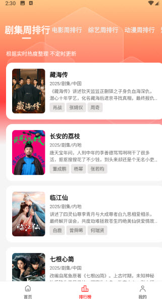 电视剧:实时更新国内外热门电视剧,无论是制作精良的国产剧,还是剧情吸引人的韩剧、美剧,用户都能第一时间追更。
