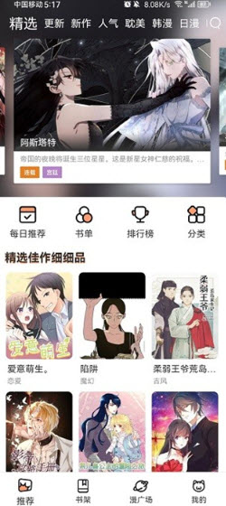 2、进入软件首页,丰富的板块一目了然,包含精选、更新、新作、人气、耽美、韩漫、日漫、欧美等,方便快速定位需求;