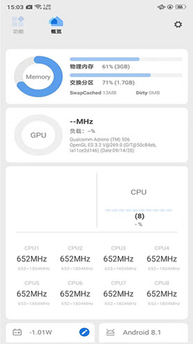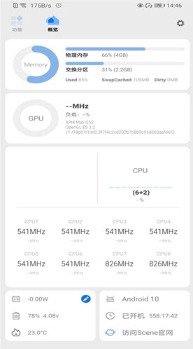 概览模块:实时展示手机核心信息,包括物理内存占用情况、CPU 实时运行状态、剩余电量、设备当前温度、设备型号、开机时长等,让用户快速掌握设备整体运行情况。