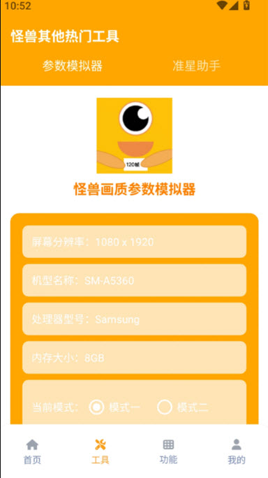 2、参数模拟工具:可实时查看设备详细信息(如 1080×1920 分辨率、SM-A5360 机型、Samsung 处理器、8GB 内存等),并提供 “模式一”“模式二” 双选项,模拟不同硬件参数运行场景。