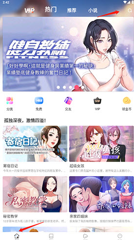 1、打开app,点击底端的“漫画”,然后点击“搜索”按钮。