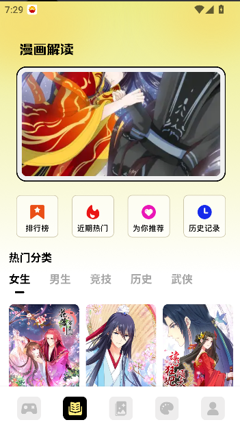 2、点击「漫画解读」模块,可通过热门分类快速筛选内容,也可在实时更新的排行榜中,查找近期高热度漫画作品的详细深度解析。