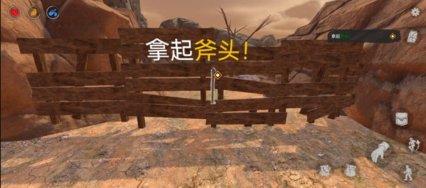 进入游戏后,玩家首先需要拾取悬挂在木栏上的斧头,随后用斧头劈开阻碍前进的木栏,开启生存第一步;