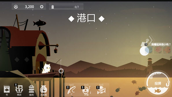 2、初始钓鱼地点设定在风景宜人的港口,通过屏幕上的虚拟摇杆,操控猫咪调整抛竿方向与力度,完成投掷动作后,静静等待鱼儿上钩。