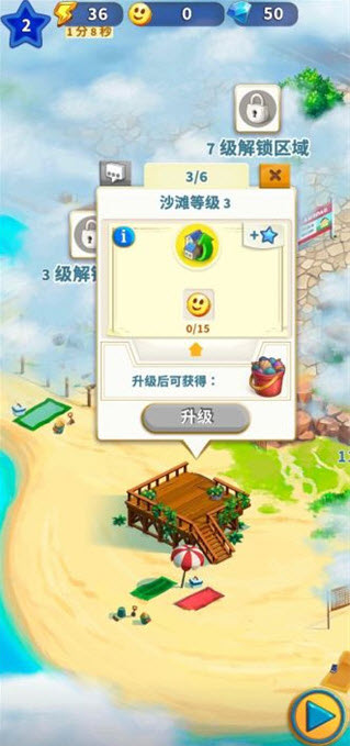 4、巧用现有金币升级沙滩设施与配套服务,提升吸引力,招揽更多游客前来打卡。