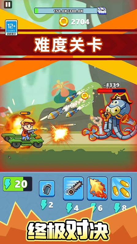 - 战斗核心:点击屏幕即可指挥肥仔射击,精准命中僵尸就能收获金币奖励。面对扎堆的敌人时,果断使用下方道具发动范围攻击,一键清空战场,爽感直接拉满。