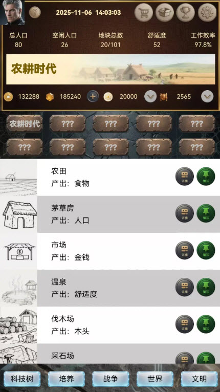 4. 粮食是文明的生命线,每位居民每日都会消耗定量粮食,务必持续升级农田、提升产量,避免出现粮食短缺导致的生存危机。