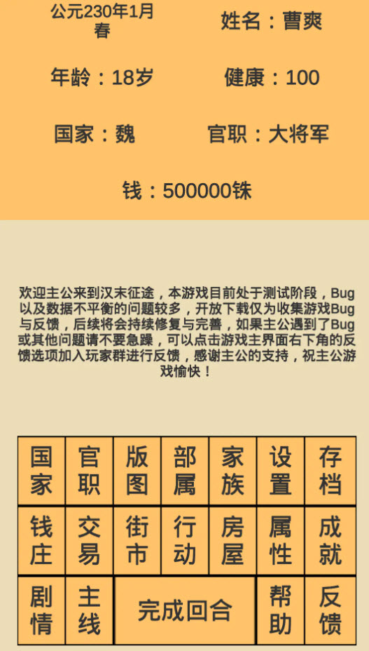 汉末征途折相思1.2.8免广告版下载以文字为刃,在三国乱世中开辟出一片高自由度的策略疆土。汉末征途折相思游戏安卓免费版下载你将以草莽匹夫之身踏入纷争,命运的缰绳全然握于己手——是入朝为相,以智谋安邦定国;是跃马扬鞭,凭战功封狼居胥;是货通天下,靠商道富可敌国;亦或是积蓄力量,逐鹿中原登上帝位。