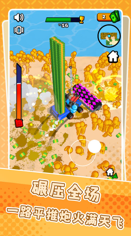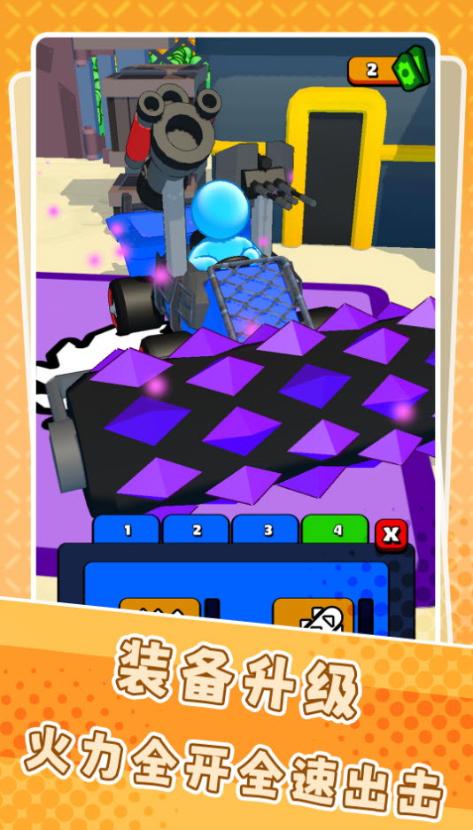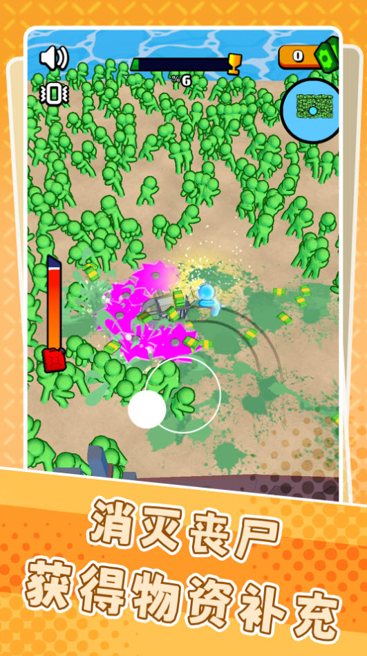 1、进游戏后,操控小人抄起割草机就能干仗,灵活走位避开僵尸围攻,逮着机会就尽情清场。