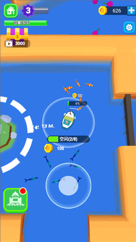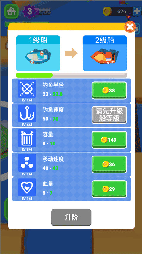 3、船只可升级属性涵盖移动速度、装载容量等,全力解锁最高级渔船,征服整片海域。