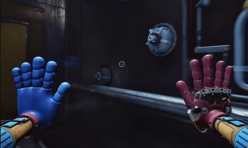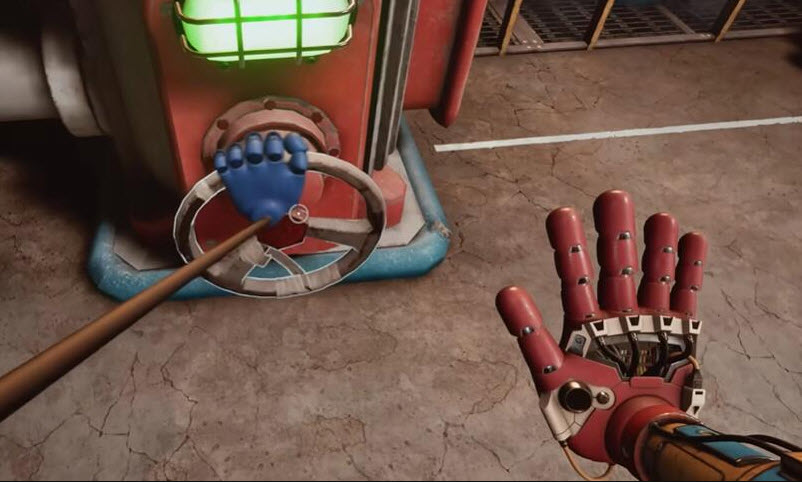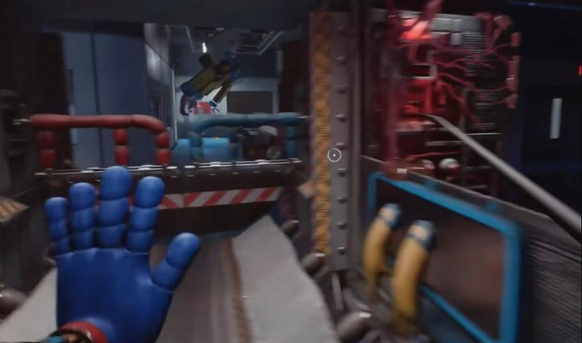 6、开门进去之后,里面还有一个开关,先给它拉下来,再往前走,用蓝色手臂去互动前面的开关,这里必须触发三个开关,才能打通电流、打开出口