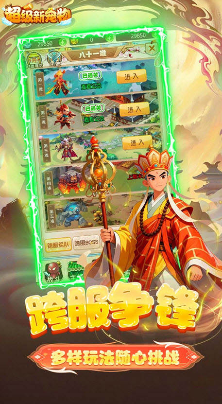 人物设计都特别精致Q萌,齐天大圣既能耍酷又能卖萌,天蓬元帅还会跳可爱舞蹈抢镜,三藏法师则是实打实的强力助战!咱们熟悉的西游场景也全部翻新,花果山、天宫、地府都能全景浏览,带你走进一个既熟悉又充满新鲜感的西游幻想世界。