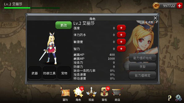游戏拥有完整的装备养成体系,包含武器、饰品、宠物、药水四大类装备,搭配不同装备可以明显改变角色属性和战斗打法。角色成长方向自由,支持筋力、体力、敏捷、智力多维度属性加点,玩家可以按照自己的喜好打造专属战斗流派。比如角色艾丽莎身板较脆,搭配高爆发技能和 6:1:2:1 的加点比例,就能在平稳输出的同时轻松应对同级 BOSS。