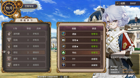 4. 阿德莱德·德布罗伊(Adélaïde de Broglie):女性,身高164cm,初始兵种为国民卫队,阵营为皇室派。曾是为皇室服务的机密组织成员,自幼接受专业训练,擅长化妆跟踪、开锁等技能,是了解巴黎街头传闻、获取情报的最佳咨询对象。