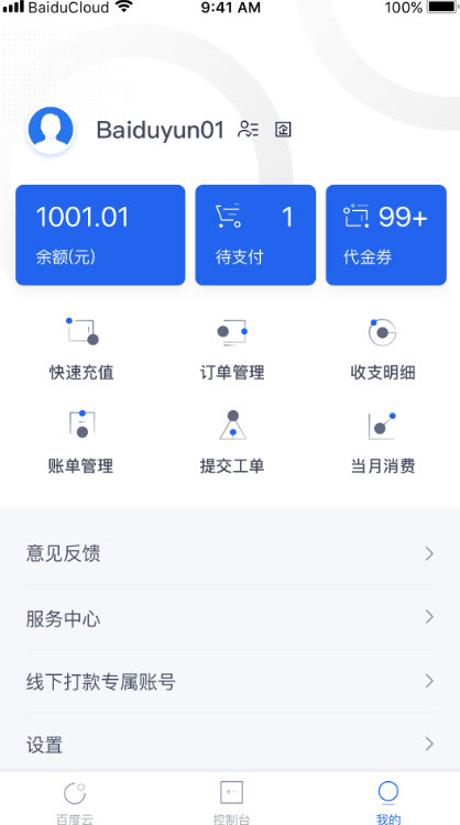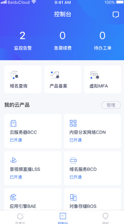 可实时查看账户信息、报警提醒、工单进度、即将过期云产品详情;同时支持查看八大主要云产品的开通状态及运行情况,便于用户实时监控管理。