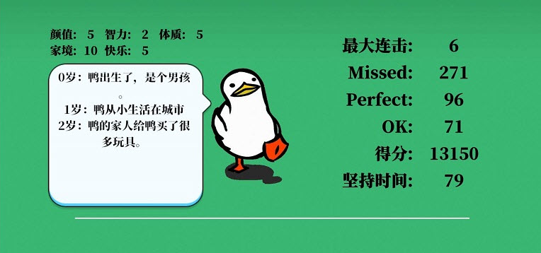 以音乐为载体,生动展现鸭子的一生,玩家跟随背景音乐的节奏,精准接住所有下落滑块,完成对应关卡挑战,解锁后续内容。