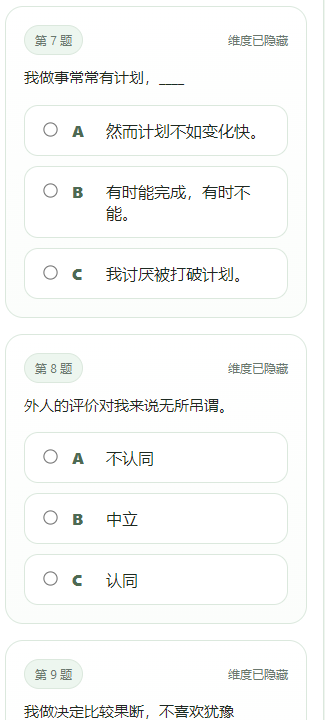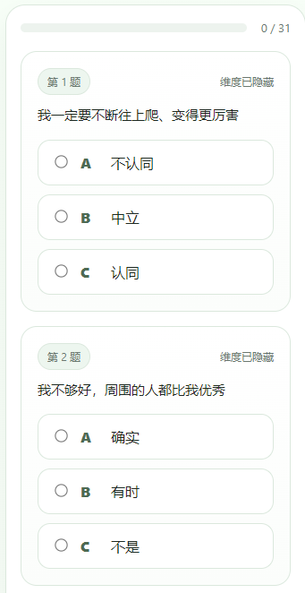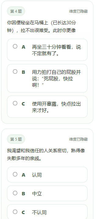 2、页面会出现十几道日常选择题,跟着自己的真实想法选答案就行,1分钟就能做完;
