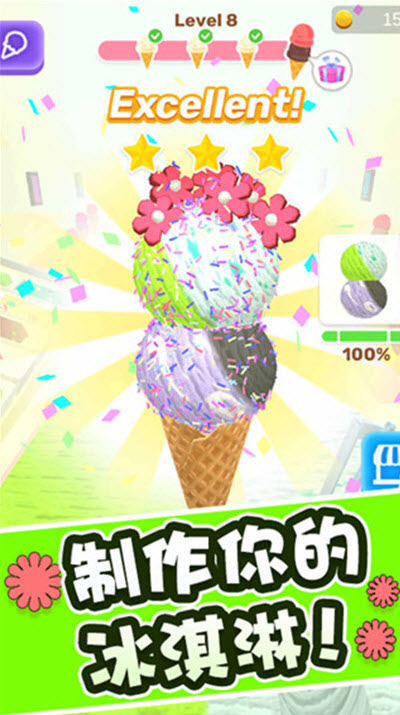 3、视觉呈现上,游戏采用清新治愈的画风,色彩搭配明快柔和,冰淇淋造型可爱逼真,场景设计简洁舒适,搭配轻快舒缓的背景音乐,既能为玩家带来愉悦的视觉体验,也能有效缓解日常压力,实现娱乐与解压的双重价值。