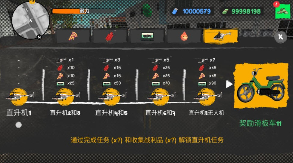 4、直升机竞速解锁:完成指定高阶任务后,可解锁挑战性极强的直升机竞速玩法,获胜后可快速解锁稀有电动滑板车车型。